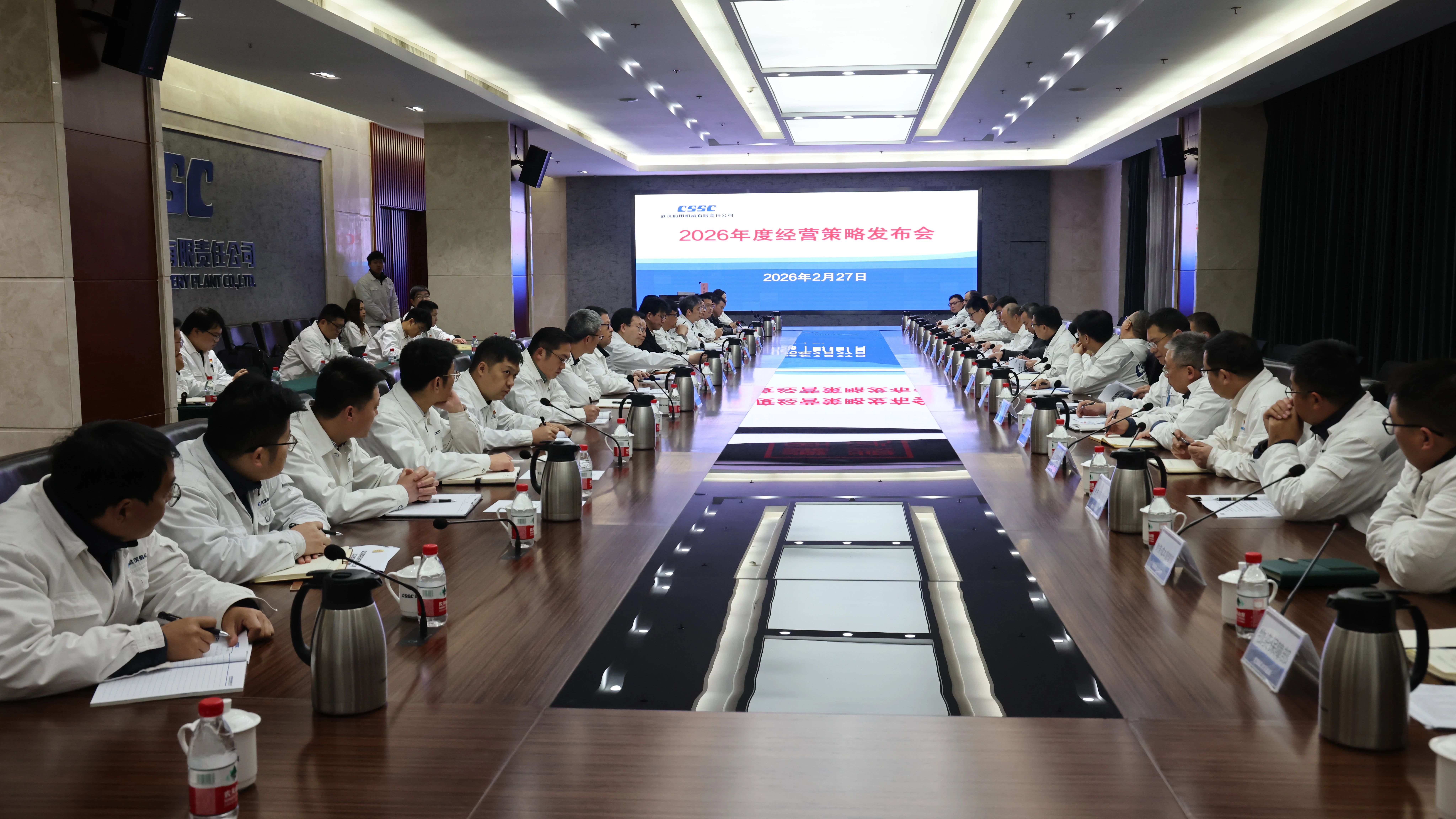 2月27日上午,中船武漢船機在研發(fā)樓102會議室召開2026年經(jīng)營策略發(fā)布會,公司黨委副書記、總經(jīng)理程立兵,副總經(jīng)理潘文勝,總會計師、工會主席陳世龍,副總經(jīng)理孫凱、副總經(jīng)理霍小劍、副總經(jīng)理胡發(fā)國、副總經(jīng)理程文池出席會議。會議由程文池主持。