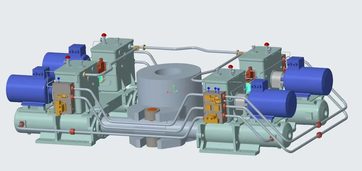 17000TEU雙燃料集裝箱船是綠色新能源船舶的典型代表,武漢船機為該船提供的舵機型號為FE42-1150-T050,最大工作扭矩可達11280kN·m,最大轉舵角度為37度,單臺舵機配備的四套動力系統(tǒng)為雙柱塞四油缸拔叉式舵機結構,具有系統(tǒng)性集成度高、可靠性高、性能優(yōu)等特點。